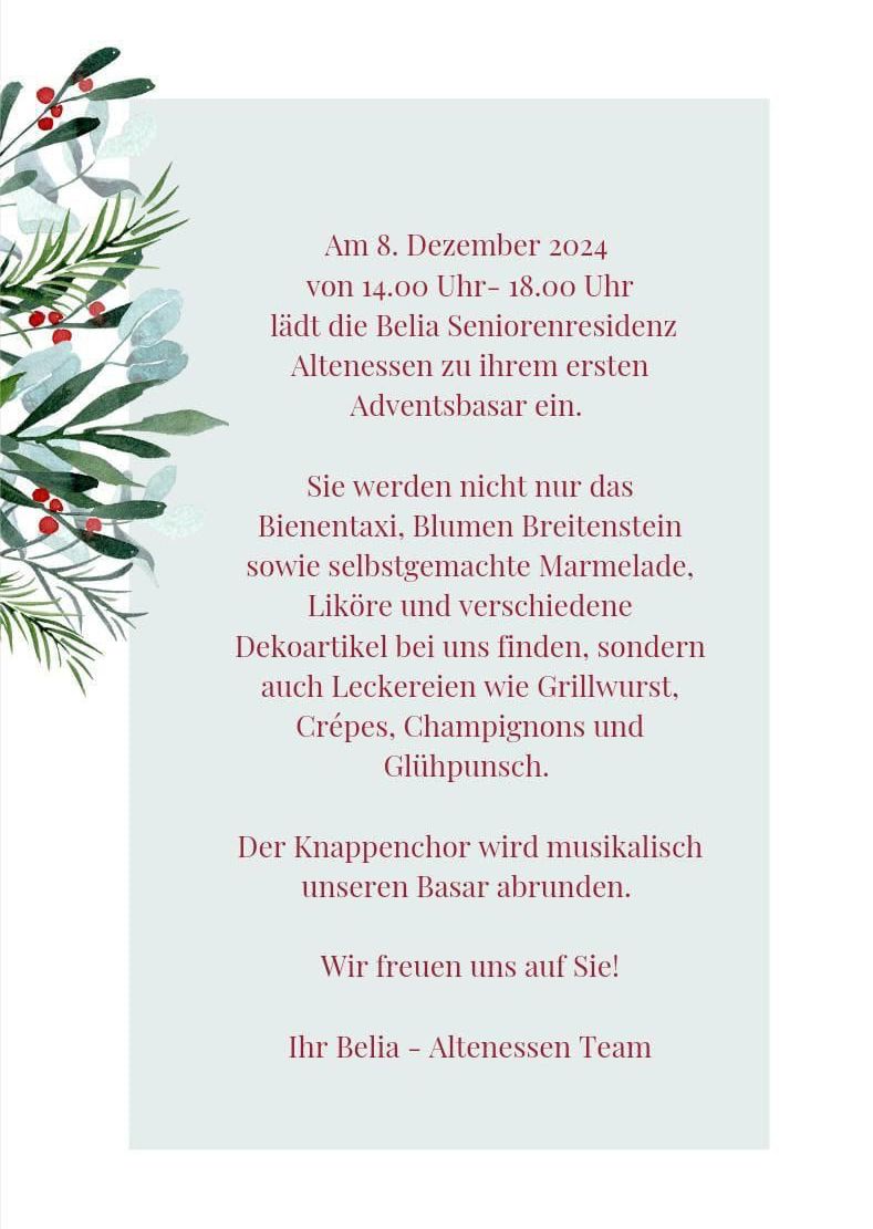 Damit auch Sie die Seniorenresidenz in Altenessen kennenlernen können, sind Sie herzlich eingeladen, am kommenden Sonntag (08.12.2024) in der Zeit von 14:00-18:00 Uhr den Adventsbasar zu besuchen.